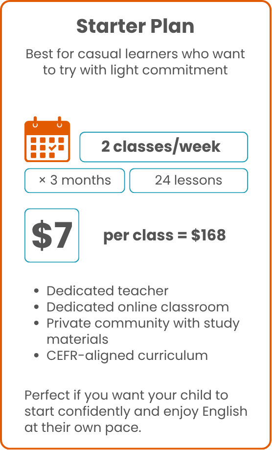 After the free trial, you’ll receive a teacher’s feedback that includes your child’s CEFR level assessment (based on international English standards) and learning recommendations. This helps you understand where your child currently stands and how we can help them improve.
